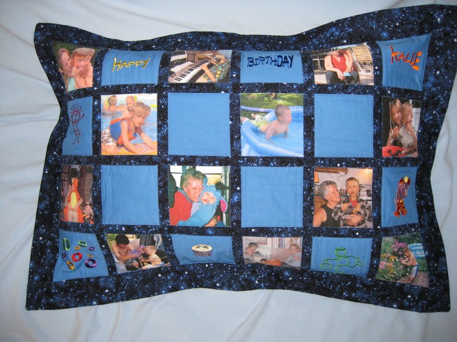 ButterflyBev Kalle - I made this quilted pillow case for my sister-in-law to give to a young autistic boy she knows. We make it very stable by zig zaging around every block. We added the embrodery for texture and pictures of Kalle and my sister-in-law.