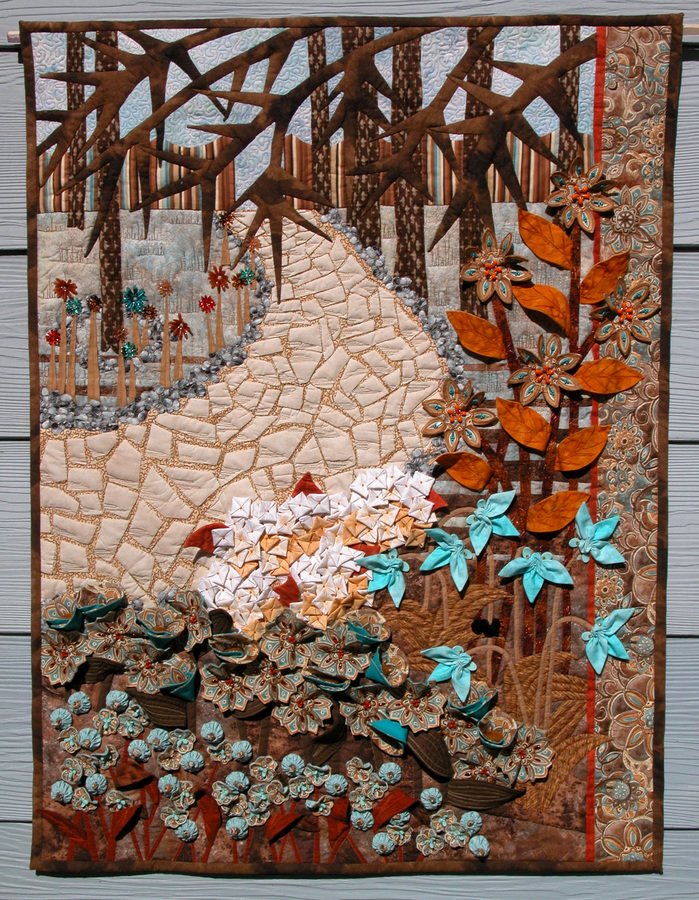 mittelmr Munsinger Garden Fantasy - This was the finished result of entering the Minnesota Quilters 2009 Quilt Challenge. This is the first time I ever did a challenge! The theme was St Cloud, Minn. I just tried whatever I felt would work. Used a photo for inspiration and soon the quilt became very 3-D along with use of vintage beads and lots of machine free form quilting!