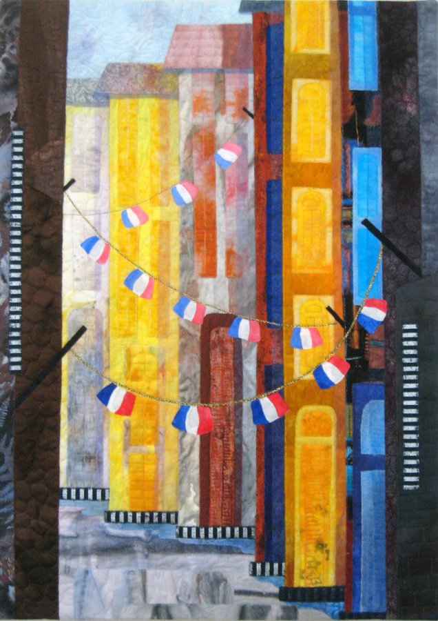 kitkavitch Bastille Day - Bastille Day was begun in an Abstracting Landscapes class by Kate Cox. I chose to abstract a cityscape instead, and used several pictures of French cities for inspiration. Many of the pictures contained laundry strung out across the street but I chose to picture small French flags instead.