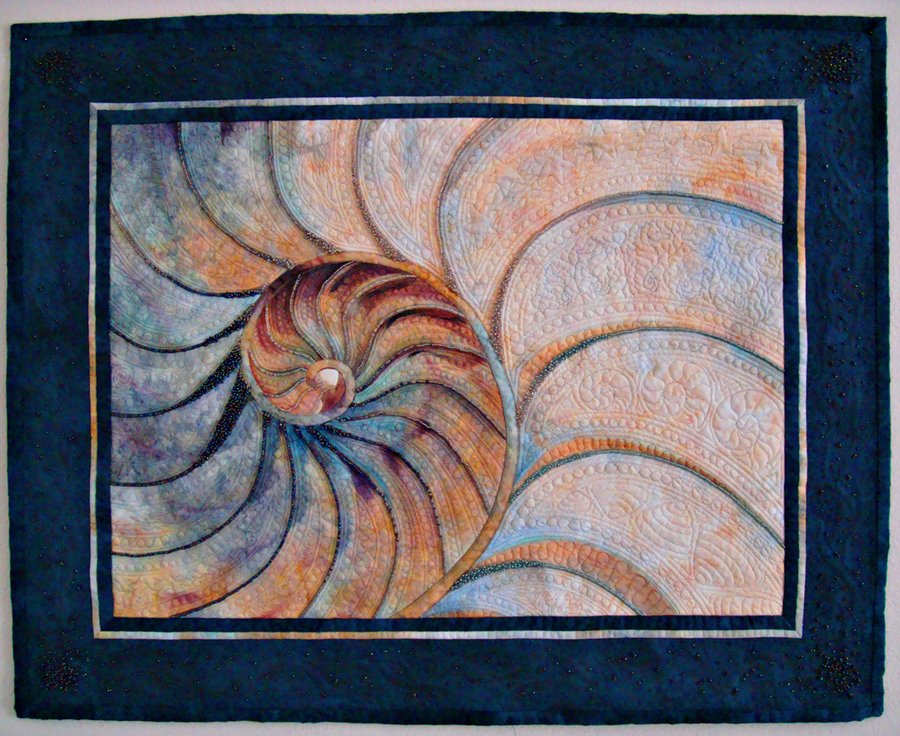 mtnhorse Sea Section - Created for a Mountain Art Quilters challenge titled Surf & Turf, this quilt depicts a sliced section of a Nautilus sea shell using a curved piecing technique taught by Sharon Schamber. Lots of seed beads were used to create additional dimension separating each section and in the outer border. Each section is quilted with different undersea creatures, including turtles, starfish, dolphins, seahorses, jellyfish and a mermaid.