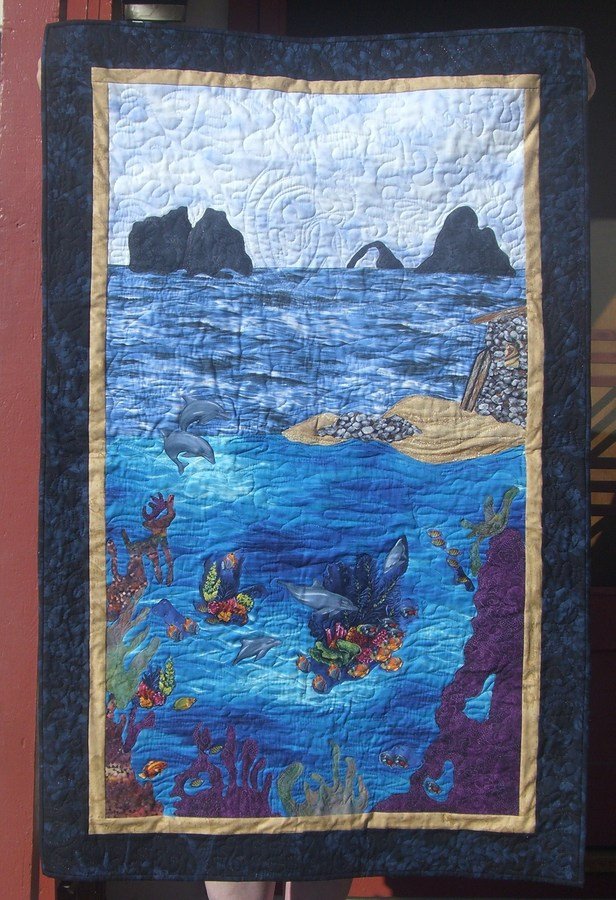 | Design Source - Description | Took a seascape class from Rob Appell in Sept 2009. Enjoyed the class. The quilt was made in memory of my son, Eddie, who loved to surf. Can you find the quilted surfer? |
