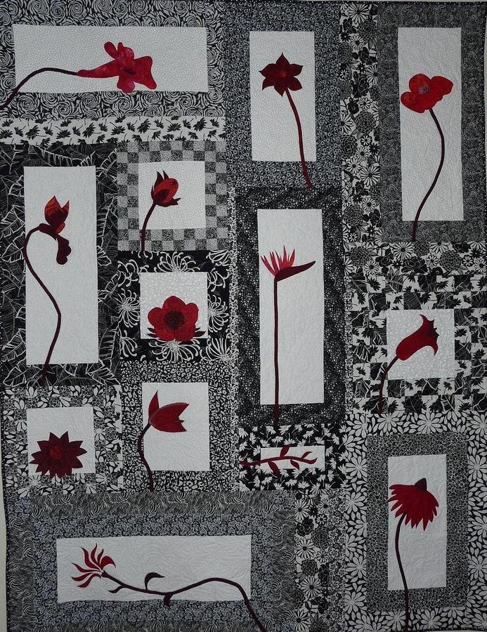| Design Source - Description | I used the pattern of the book, but I changed a few flowers, because I liked these more. It is made of all kinds of different black and white fabrics and reds for the flowers. I used quiltpatterns I liked. |