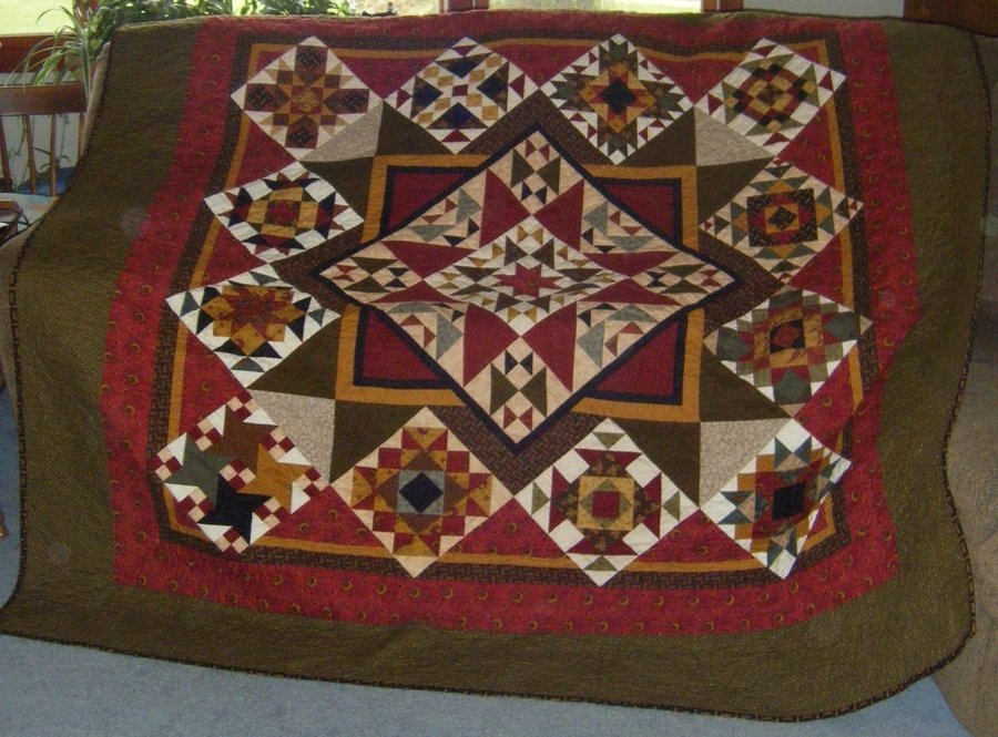 she-quilts Pieceful Nights - I completed the 12 surrounding blocks as part of the 2008 BOM at my LQS. I then added the medallion center as the pattern suggested. The outer border is one I added to increase the size of the quilt and to give more quilting room. :) There is a lot of mitering here and I love that! I had the top assembled by Feb 2009 but with both kids graduating from high school & college that May, I didn't quilt it until that summer and finished the binding in time for our local show in the fall of 09. I quilted this on my Bernina 200 using Superior Rainbow thread. The borders and setting triangles are free-motion quilted. My first thought was that I'd give this to our son as he graduated from high school in 2009 but he said he didn't want it. : Maybe someone will love it later!! :)