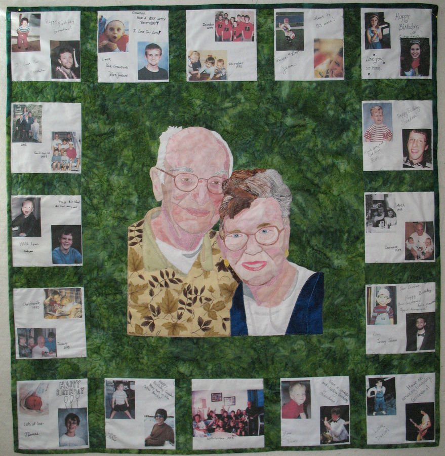 joanrae Mom's 80th Quilt - It's been 10 months of work, but this quilt is finally competed! This is a portrait of my in-laws, Paul and Ruth Johnson, with borders of 6 inch squares of the 11 grandchildren and group pictures of them. We will present this quilt to mom in November when we all gather to celebrate her 80th birthday. This is a surprise, so if there are any of her friends on this site, don't tell her!