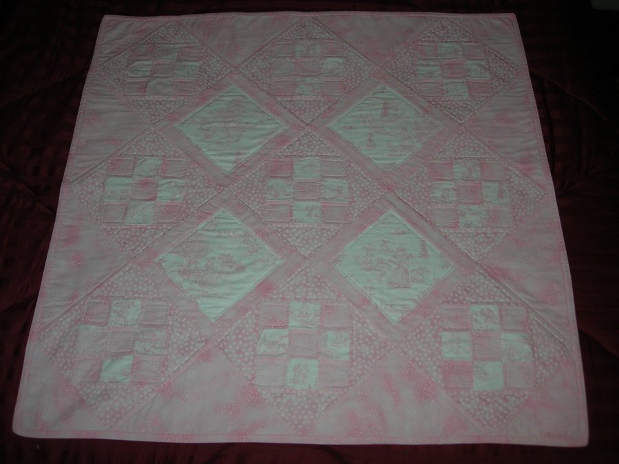 NannyLou Baby Molly's Nursery Rhyme Quilt - My grand neice and nephew, little Molly and twin brother Luke were born 3 month premature - tiny, tiny babies with a long stay in the hospital. I used 4 different pink fabrics highlighting the nursery rhymes on toile in the four center squares which I outlined with the darker of the fabrics. I then made nine patch block set in squares and put the blocks together on the diagonal.