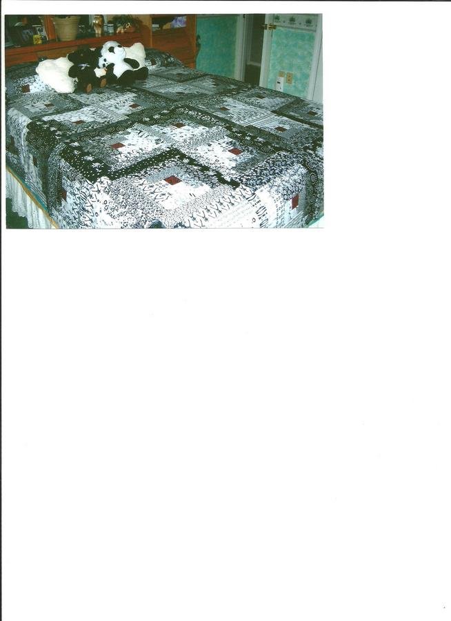 | Design Source - Description | Black & white materials used with the center block red , so as to indicate the heart of the home. Notice the star layout in the center of the quilt. |