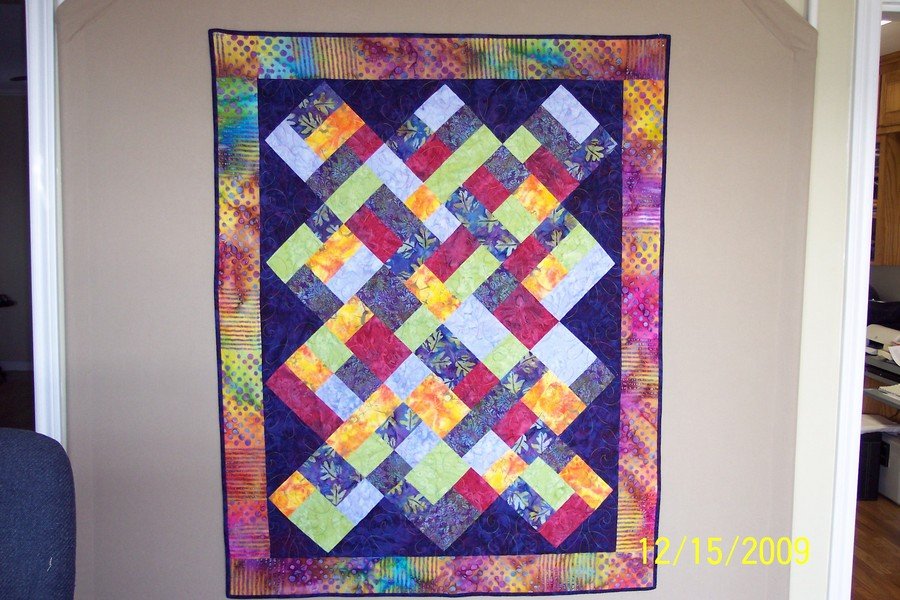 BjoLiz Turning Leaf - I collected interesting fabric from all over - some as far north as South Dakota and then constructed this quilt for our youngest daughter, Kelley. She was a winemaker for E&J Gallo in Livingston CA for awhile and gave it up to come home to Texas and marry her high school sweetheart. The quilt name represents not only some of the batik fabric, but also, one of the wines she made was bottled under the label of "Turning Leaf". The border reminds me of some of the beautiful rows of grapevines in the many vineyards in California.