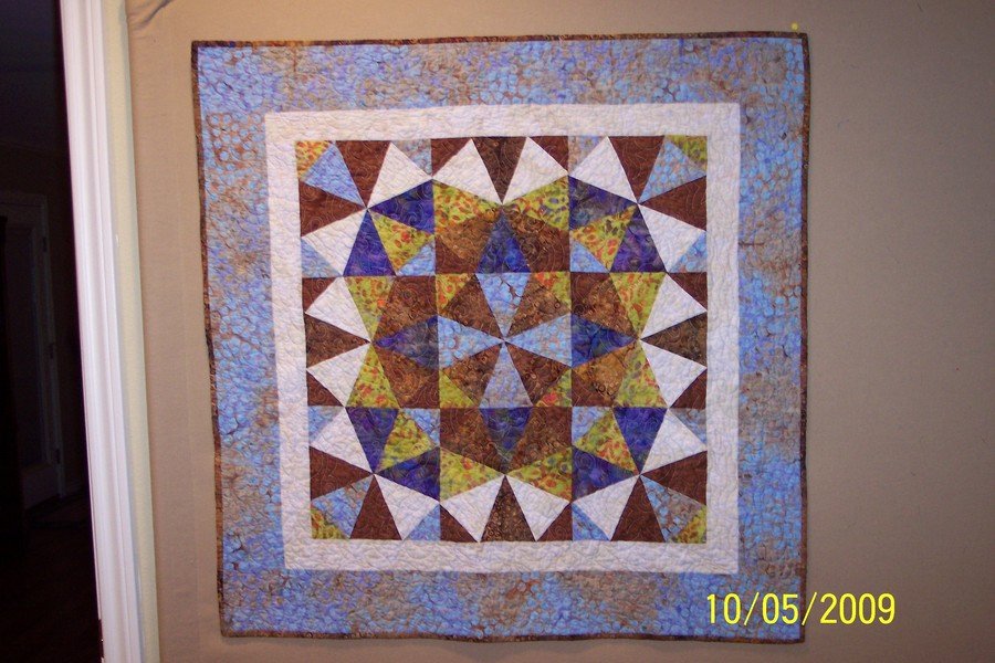 BjoLiz Pebble Beach - This was my first, and so far, only Kaleidoscope quilt. I watched the TV show Quilt in a Day with Elenaor Burns, took notes and had fun creating this little quilt. This was a baby gift to my niece for the birth of her 1st son. I love the way the colors play out and create interesting circles.