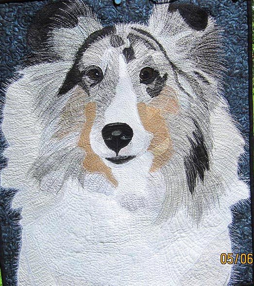 cddebbie shelti - While at the Harrisburg Pa Dog show in March, I was showing my "Moonshine Quilt" to a fellow artist. Rona just happened to be in Bev's booth, took on look at my quilt and asked me where I bought it. When my friend Bev told her that I make them, she asked if I had my camera with me and took me by the hand. Before I knew it I was snapping pictures of her daughters sheltie! Sheltie is an original from the pictures I took that day. The pattern process is of my own design.