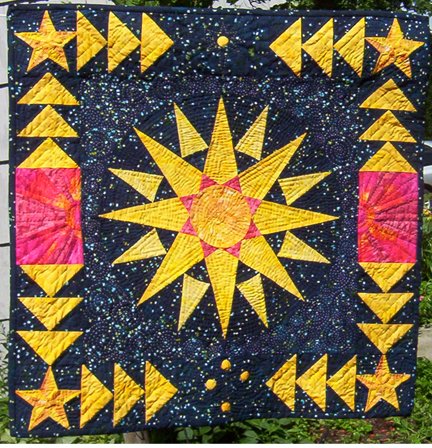 cddebbie Blissful Seas - I started this Mariner's Compass while participating in a class taught by my friend Sharon Stroud. boarder was of my own design. the north star, southern cross, geese flying north and south, pink sky at night, pink sky in morning and nautical stars in the corners. I also chose to borrow from VanGogh's "Starry Night" for my hand quilting.