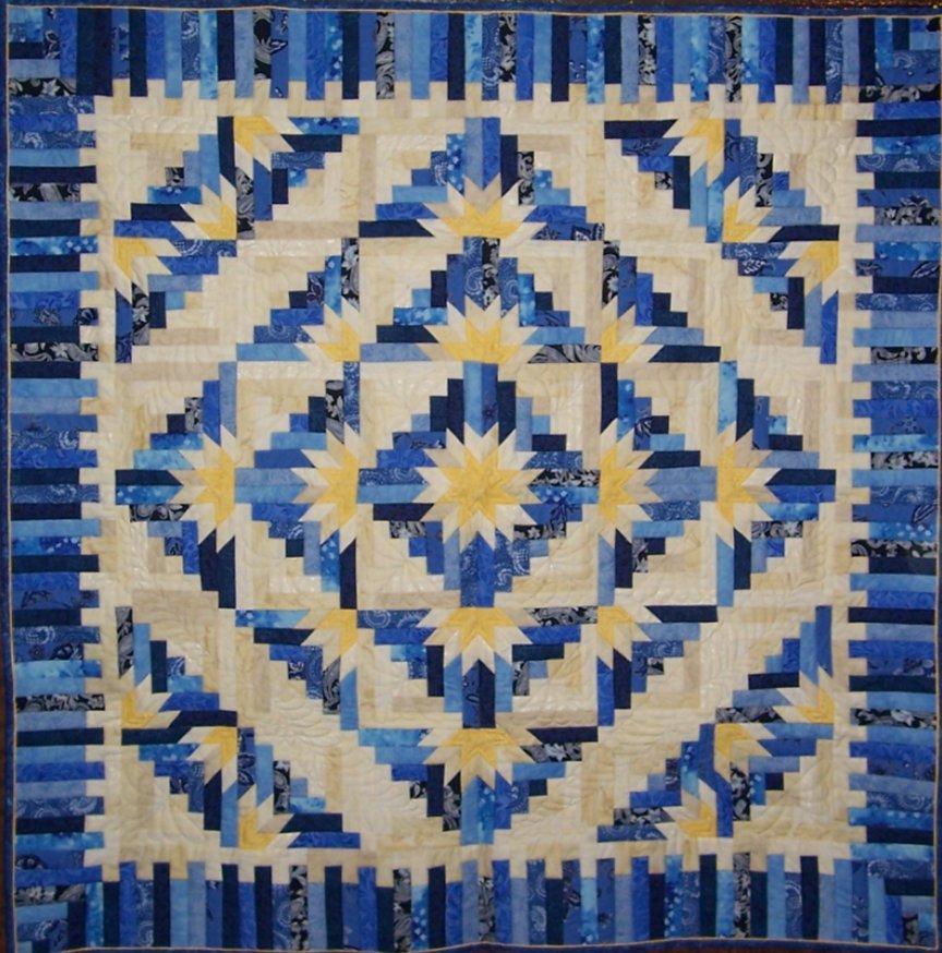 PennyM Timberline - I had the opportunity to teach this quilt to quite a few students - it requires a lot of cutting - and I mean A LOT of cutting, but the results are well worth it. I love when we can tackle an obstacle that students are anxious about - this quilt helps us get over Y seams. I chose the blue and yellow theme in honor of my alma matar - Medaille College in Buffalo, NY.