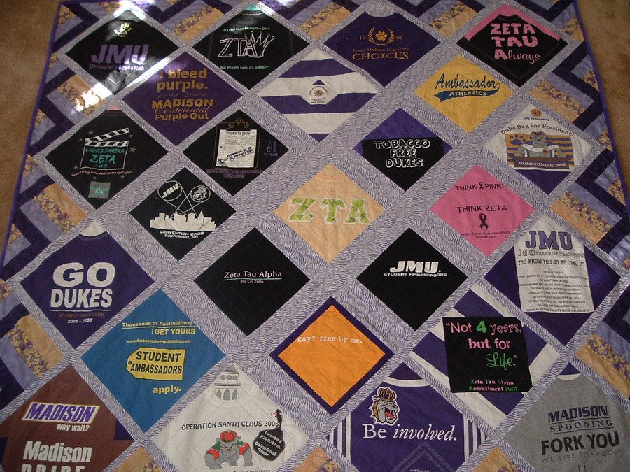 | Design Source - Description | Made from 25 JMU T-shirts. Made for my Granddaughter Lisa from her sorority mentors shirts as a gift. |