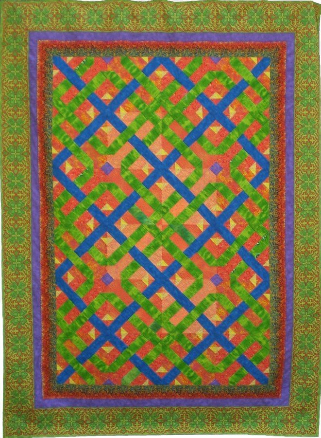 bethbmcginn Hot, Cool Celtic - Quilt size: 72” x 96” 24 Blocks sized: 12” x 12” This full size quilt is for my biggest fan, my son, Connor. He loves the bright colors. The scrappy background adds a lot of light to the quilt's center.This was the first quilt I made with miterred corners.Mary Ellen Hopkins inspired me to play with design until I found something I liked. Thank you, Miss Mary Ellen.