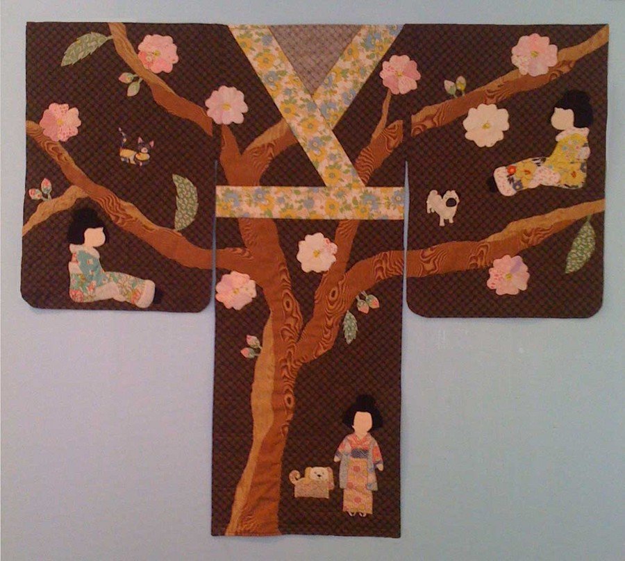 bethbmcginn Kimono Su - This wall hanging or table runner is a charming use of 1930’s fabrics combined with replicas of 1930’s Japanese dolls and their pets placed under a large cherry tree. This scrappy machine appliqué quilt was designed as a quilt guild challenge of four appliqué blocks based on the idea of a Sunbonnet Sue.