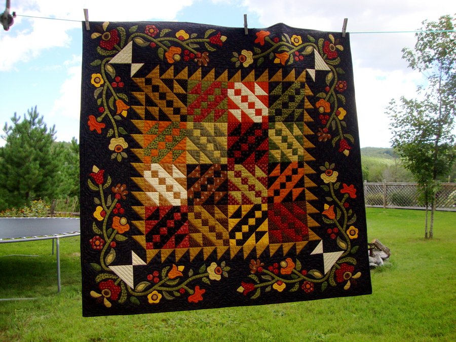 brendap Jacob's Garden - I love the bold colors and black background of this quilt. I pieced it over a year ago and decided to finish the applique this summer. It went suprisingly quickly. I love it and hung it in my den against a brick red wall.