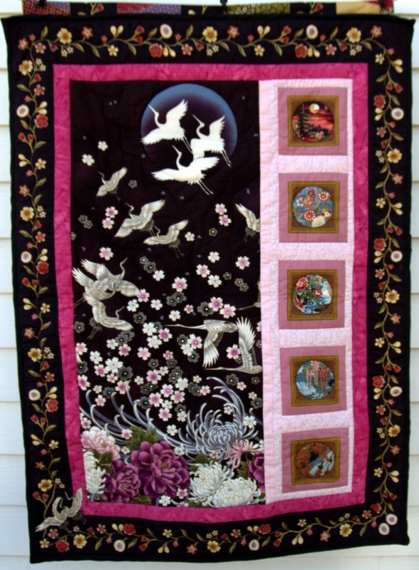 MEMA1 Cranes Across the Moon - Cranes fly across the moon and below are gorgeous chrysantemum blooms. To the side are log-cabin-like blocks with Asian motifs at the center. The flowers have been embellished with hot-fix rhinestones. The border was made from a fabric with a vine in it. I had to piece it together to keep the vine running around the quilt. The lower left-hand corner had a pair of cranes appliqued onto the border. This helped cover up a spot where the border was being especially difficult (LOL). I also emphasized the moon by putting a second layer of batting underneath. This wallhanging was made for my daughter-in-law for her birthday. She has had a TERRIBLE year, undergoing surgery on her cervical spine for a tumor, after months of pain and diagnostic procedures (usually more painful). She was so depleted and tired she was not her usual sunny, happy self. I felt I could help with a wallhanging that reminded her of Korea. After she got it, she called me to tell me how she loved the gift and how it reminded her of her Korean home. She sounded better (thankfully).