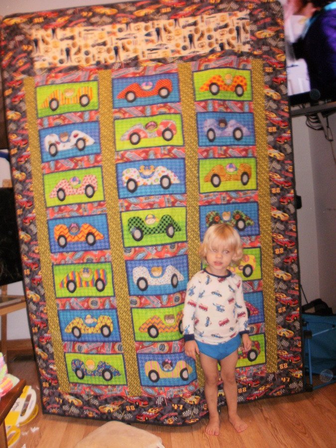 gunnywendy Connor's Quilt - This racecar pattern was used, as Connor has a little brother, Hunter, of whom, I used another car design for him, as they share a bedroom. Anyways, Connor cannot sit still, and is always running around the house, hence, the reason his dad chose the racecar. Anyways, the top of both quilts have a piece of policeman fabric, as their dad is a Chicago police officer, and it seemed appropriate to include it on the quilt. The quilts are on their beds now, and both boys cuddle in them while watching TV downstairs.