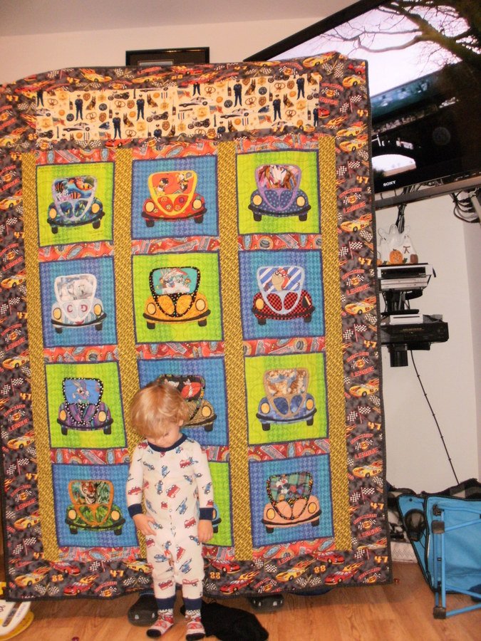 gunnywendy Hunters Quilt - This quilt was oneof two for two brothers. Hunter is the younger by 1 year and he shares a room with his big brother, Connor. Ergo, the reason for 2 car quilts. Hunter is the one who likes to think things thru, so I chose the slower car for him. But, both cars have a piece of policeman fabric at the top, as their father is a Chicago police officer.
