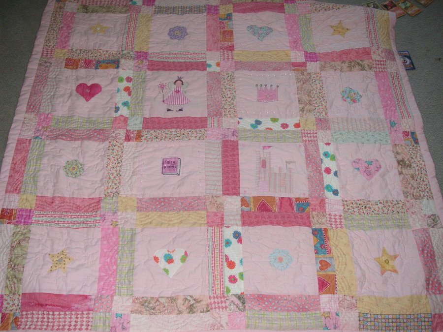 marimilie Princess quilt - This is a quilt that I made for my Pink Princess-mad about all things fairy - daughter. I just played around with applique, fussy cutting some prints, adding embellishments etc. to make a girly quilt. Handquilted.