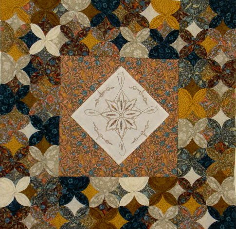 clairegrahamsmith Window For Jane - This was a local shop challenge quilt. Several of the fabrics were supplied and the max size. I was inspired to add and collect many William Morris fabrics. By the time I had nearly used up the fabric just making windows, I thought they would make a nice border. Teaming them up with a section of an old table cloth from Spain, it evolved from the outside in. My sister Jane brought it back from Spain many years ago.