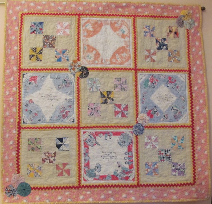 ashibut A '30's Revival - I have been making quilts using old handkerchiefs, and this one uses four survivors of the seven "This is the Way We .... early Monday, etc. Morning" hankies I had as a child. (I had five, so used the fifth in the label on the back.) To make the pinwheels I opened and pressed old yo yos made by my aunt in the 1930's. I used additional yoyos as embellishment. The border was a piece of vintage fabric, and to spice up the whole thing I used rick-rack found in my Mother's sewing box,marked 25 cents, so it was obviously old, too.
