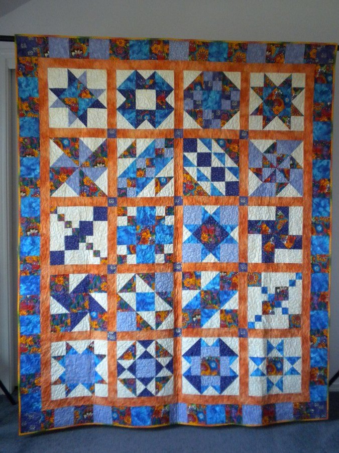 Katiezquiltz Peek - A - Boo Kitty - This quilt is a sampler and I learned to do many techniques unique to quilting. It was my springboard. I had collected fabrics for many years and was determined to not have to buy anything to complete it. I had to buy orange for sashing because nothing else worked. This quilt also sprung me into the world of orange and I am grateful for that.