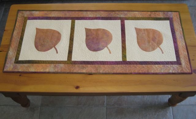 janmt A Gift for Amy & Jim - I designed this table runner as a gift for a friend's mountain house which is surrounded by aspen trees. The fabric is what makes this very simple design. The hand dyed fabrics are actually from Ricky Tims! I had been holding on to the fabric for a bigger project that I have stewing in mind but decided to part with a little for this special gift. The gradations in color in the leaves make this simple table runner something out of the ordinary. This is a lesson that I plan to apply to future projects!