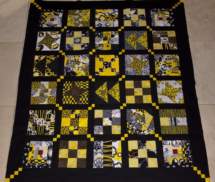 bystrauss Bumble Bee Quilt - I made this quilt top in my second quilt class. We learned various types of block designs plus a few of my own creative blocks...:) I loved the black, yellow, & white fabric bundle I got from KS Quilts but had no idea what I would do with it. Well, with that bundle and a few more prints here's what I ended up with. PS..I also wanted to try out Ricky's simple flying geese technique...I love it. What a blast! I am hooked on quilting.
