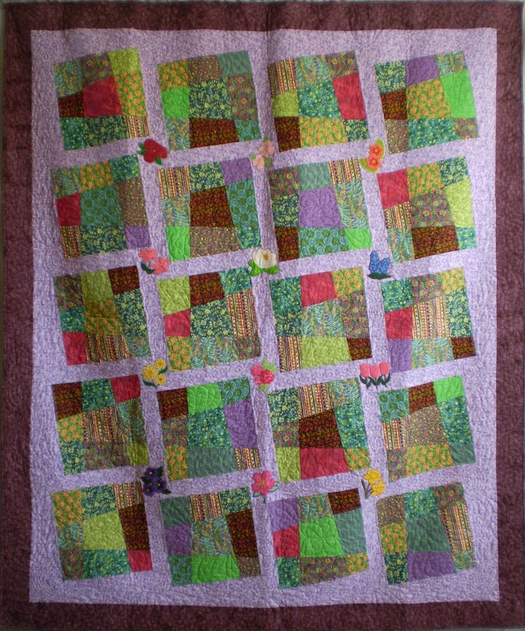 kegarth Garden Games - I made these "hopscotch" stack and slash blocks in a class with Dianne Hire. Later, I designed the slightly on point setting, and appliqued flowers at the cornerstones with digitized machine embroidery. I put some leftover blocks from Dianne's class and some log cabin blocks on the back.