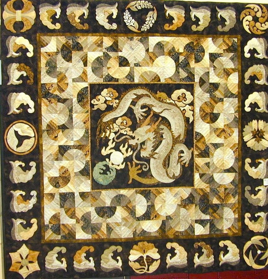 paulaj Pearl of the Dragon - I saw a photo of a dragon in a book years ago and saved it. I finally decided to enlarge it to incorporate it into a king size quilt I was making for my bed. The quilt also uses the "Strips and Curves" technique developed by Louisa Smith. The designs around the perimeter are Japanese family crests I adapted for applique.