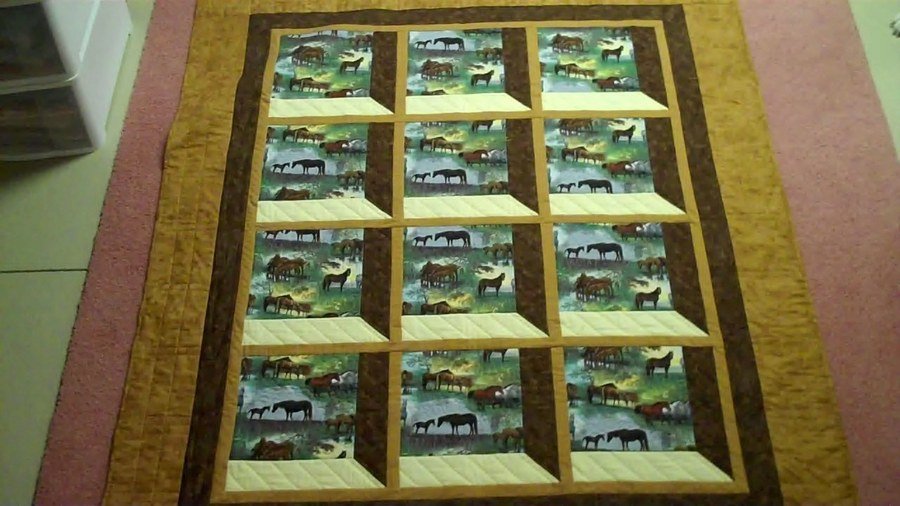 | Design Source - Description | Made for my Great Niece Shaylin's tenth birthday. I stippled horses, lined window frames, quilted carrots, horseshoes, fencing, her full name, quilt name in the sashing and borders. |