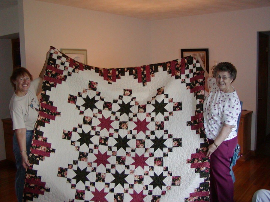 | Design Source - Description | Gift for my Aunt Nada. This queen size quilt was from a Hancock Retreat in Ashland NE. Main Star Green and secondary Burgandy. Piano Key border. Connie is in White and Pink on right, I'm left. |