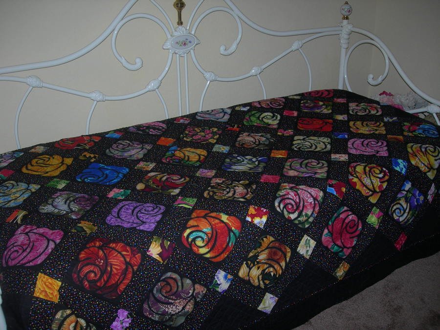 GRAMMERANN Rose of Many Colors - Thank you to Margo and others for help with this one. When I was ready to sandwich it would not lay straight for anything. I even took it partly apart and resewed it. I was suggested that quilting the blank areas might help stabilize it. It did to a degree, now the applique blocks dent to bulge a little but it looks ok on a mattress - not as a wall quilt.