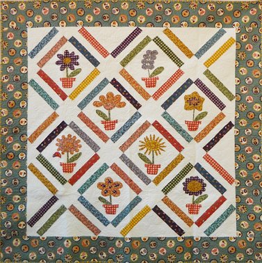 jeanannquilts Garden Posies - I loved the cameo flowers on the border of this fabric. I scanned them and blew them up on my computer, then traced each flower to make the applique patterns for the blocks. I used a rail fence setting and with only 8 blocks arranged the blocks to zig and zag from row to row.