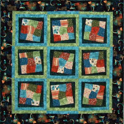 jeanannquilts Sound Waves - I have a friend who is a jazz musician so I was thrilled to make a quilt with a music themed fabric. I cut the nine patch squares "wonky" , mixed them up and sewed them together using a shuffle system. After the blocks were finished I squared them off using an 8" square ruler and a zig-zag blade on my rotary cutter. Then I appliqued the blocks on top of the black squares. It sounds involved, but I made the top in a day.