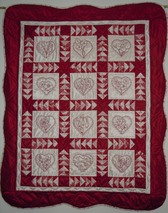 | Design Source - Description | I adapted Alex's redwork hearts pattern using solid red and white silk bought in China along with Alex's red and whilte cottons. A challenge in using silk and scalloping a border |