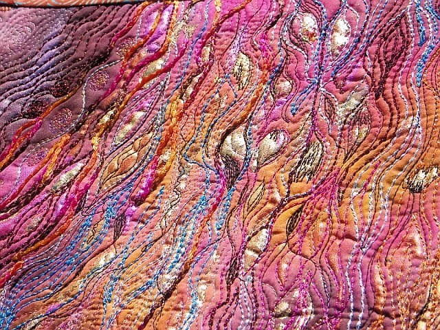 LeslieAnn Bonfire At Sunset - Original, art quilt features my hand-painted fabric that was inspired by a summer bonfire on the lake at sunset, roasting marshmallows, telling stories, watching the ever-changing colors of the fire, lake and sky... This one-of-a-kind hand-dyed and painted fabric features sunset hues in soft pinks, corals and soft golden yellow tones with a hit of chocolate brown richness as the sunset fades. Intricately quilted with lots of thick metallic threads, building on the fire theme where silver, black, copper, and gold foil meld together with sparks of turquoise, red, pink and orange as the fire crackles and wood pops and sparks... It really brought back memories of roasting marshmallows! A soft, creatively curving binding follows the lazy line of smoke from the fire, as it collides with spunky sparks, floating upward into the late dusky night sky. An original design from MarveLes (Leslie McNeil) Art Quilting. Approximate size is 20" wide by 36" long.