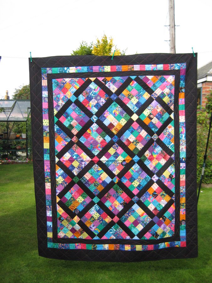 sengtser1 Scrap Quilt Two - Not sure where I got this idea from - various pictures over the years and Google Images for scrap quilts. I didn't have a pattern for this - just worked it out myself. I am pleased with how it went together - I tried to be random and not worry about placing the colours but I found myself trying not to put the same colours side by side and now notice that I failed in that!