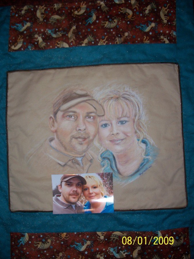 IntuitiveArtist The Happy Couple - I used cotton muslin, native american print and turqoise solid fabric for the border. Chalk pastels and inks for the portrait, and covered in tulle. This portrait quilt was made for my friend's brother and his fiancee. She gave it to them for a wedding gift.