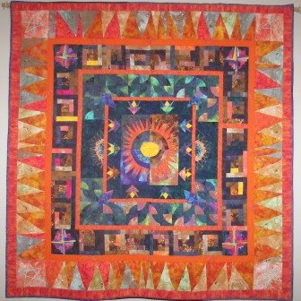 Chloe My Challenge Quilt - This is a quilt made as a challenge with my quilt group. We chose our own centre block, which I did following a Valori Wells pattern, and then each month were given a new instruction as to how to complete the next border. I prefer piecing so when the theme was 'flowers' I did foundation-pieced flowers, and for a nine-patch I did wonky little nine-patches on the corners of the previous border, and so on. The last border had to be 3-dimensional, so the triangles are made of large pieces of fabric scrunched to fir a smaller shape and beads have been sewn on. It was great fun and I learnt a lot from it, especially things like working out measurements and planning the colours.