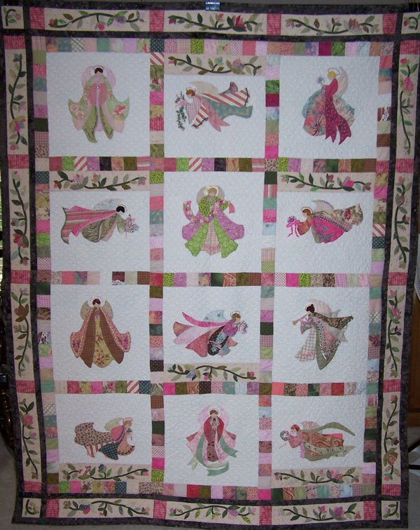 DebbieWolf My Mother...Always My Angel - This pink angel quilt commemorates the 100th anniversary of the birth of my beautiful mother, Irene, on March 30, 1910. She was a breast cancer survivor and these 'pink' angels represent her hope, endurance, strength and faith. Mom was truly an inspiration to me...she's 'always my angel' and is always in my heart. This was my first attempt at back-basting needle-turn applique and ribbon embelishments. Since we spent countless hours together embroidering as I was growing up, I felt Mom like a guiding angel over my shoulder while making the quilt.