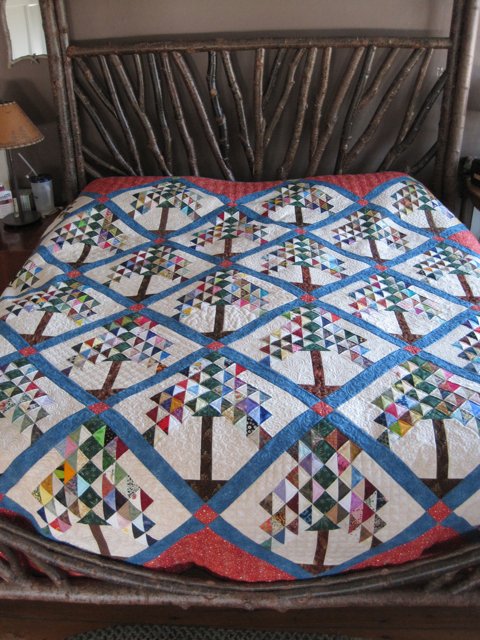 | Design Source - Description | This quilt is made from 700 HST's received in the Quilt Show SOTTT exchange. I used a different quilting design behind each tree. The border fabric glows in the dark! |
