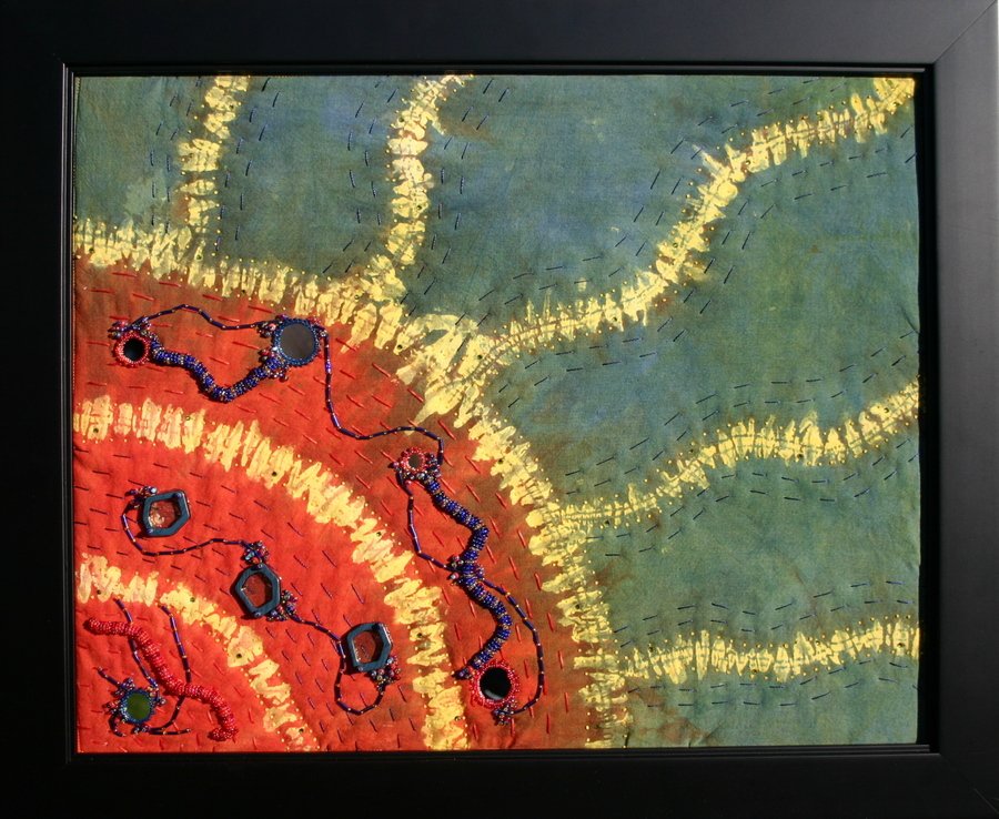 fabricplayer101 Sunspots - Sunspots began it's life as an ordinary piece of cream muslin. I shibori dyed the sun design. Next it was overdyed with yellow. It sat for quit awhile as I contemplated how to give it a little 'pow' I added beads, tiny mirrors, angelina film, swarovski crystals, and hand quilting. This was made for a show at The Textile Center in Minneapolis, MN called A Common Thread. The show is in January 2011. Since it was made for a show at the Textile Center I decided to finish it with a frame. I really like the frame with it, I think it finished it off nicely.