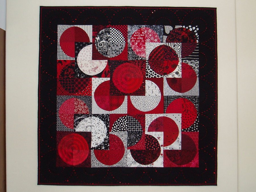 Scoopie Pi R Squared + Bling - I collected Red/Blk/Wht fabrics for about 10 years, for this quilt. Each pie shape relates to its connecting background, in some manner. For insance, there is a Kokopelli in one pie, and the background is musical notes. (Lighthouse/lobster, etc.) This was fun, but also a challenge. Once the quilt was done, I felt it needed something, so in 2010 I added about 500 red Swarovski crystals to the border, and the main center block. That did the trick!