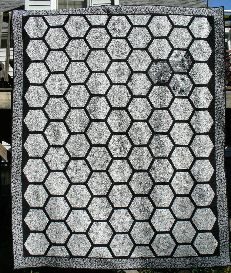 | Design Source - Description | kaleidoscopes were cut by stack and whack then black added before they were sowen. The cubes were drown on paper to get the size I needed. Quilt has cubes on the back making it reversible. |