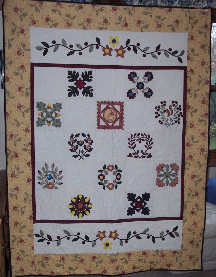 NancyAnn1959 Baltimore Album-ish - Many blocks were done while I was teaching a class on needle turn applique at a shop called the Picket Fence in Kendall, NY. The shop is now closed. I had marked it for hand quilting but my hands hurt too much for alot of hand quilting and it was not getting done. After attending a quilt show, I was inspired to wash out the markings and finish it on my machine. I'm very happy with the results and glad to get a UFO done.