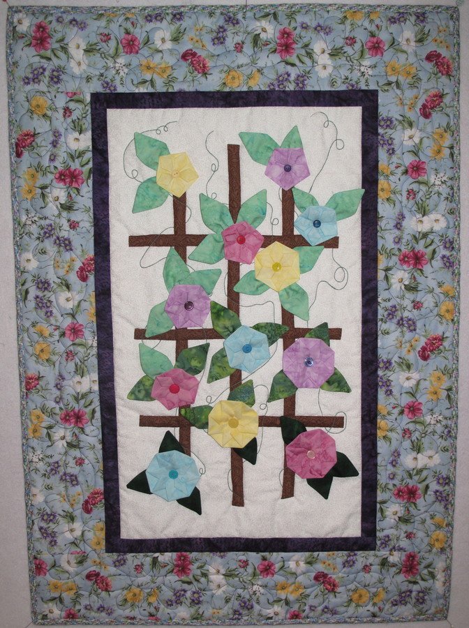 MaryRinWI Kylie's Spring - Kylie was an exchange student in our community the year our daughter was a senior. We attended her wedding in Australia in the fall of 2011. She had requested wall hangings that would remind her of the seasons in Wisconsin. This is the one I created to represent summer. There are folded fabric flowers of various types growing on the trellis.