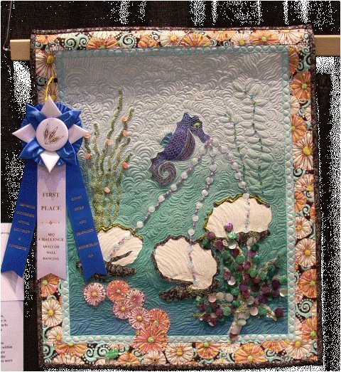 cindywilsonmn MQ Challenge 2008 - This was designed for the 2008 Minnesota Quilter's Challenge, which was to commemorate the MQ's 30th Birthday. In the design, there are 3 shells, one for each decade. From each, the seahorse is pulling a string of 10 pearls, one for each year. The fabrics were all a part of the "Challenge Packet" to be used for the project. This not only won 1st place, but it was then put into the Silent Auction and brought almost $250. I was very honored.