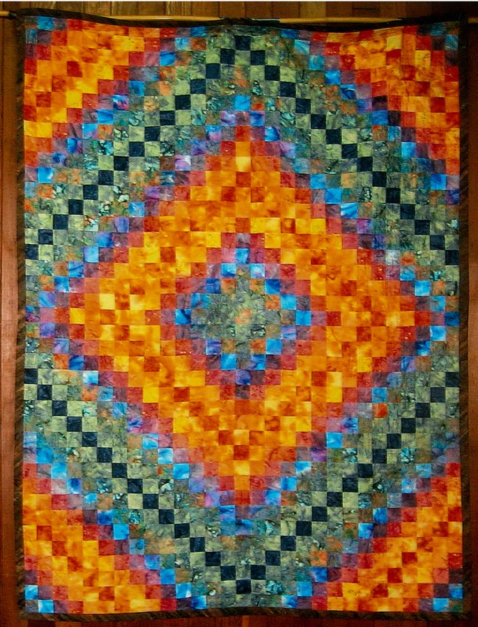 lotti life just gets better A - wanted to make as much use of the wonderful batiks as i could there are two - colours reversed made these for my parents' 70th birthdays each quilt has the names and birthdays of all direct family members quilted on the reverse (my parents, my siblings, their wives and their kids)