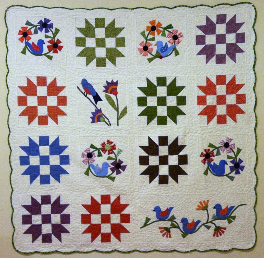 makesgeese Birds of a Feather and Blocks Together - I just wanted to make a quilt that I could name, "Birds of a Feather and Blocks Together". It has some traditional Sisters Choice blocks combined with flower and bird applique blocks. The applique is a little Baltimore with a clear Piece O'Cake influence. I loved making this quilt.